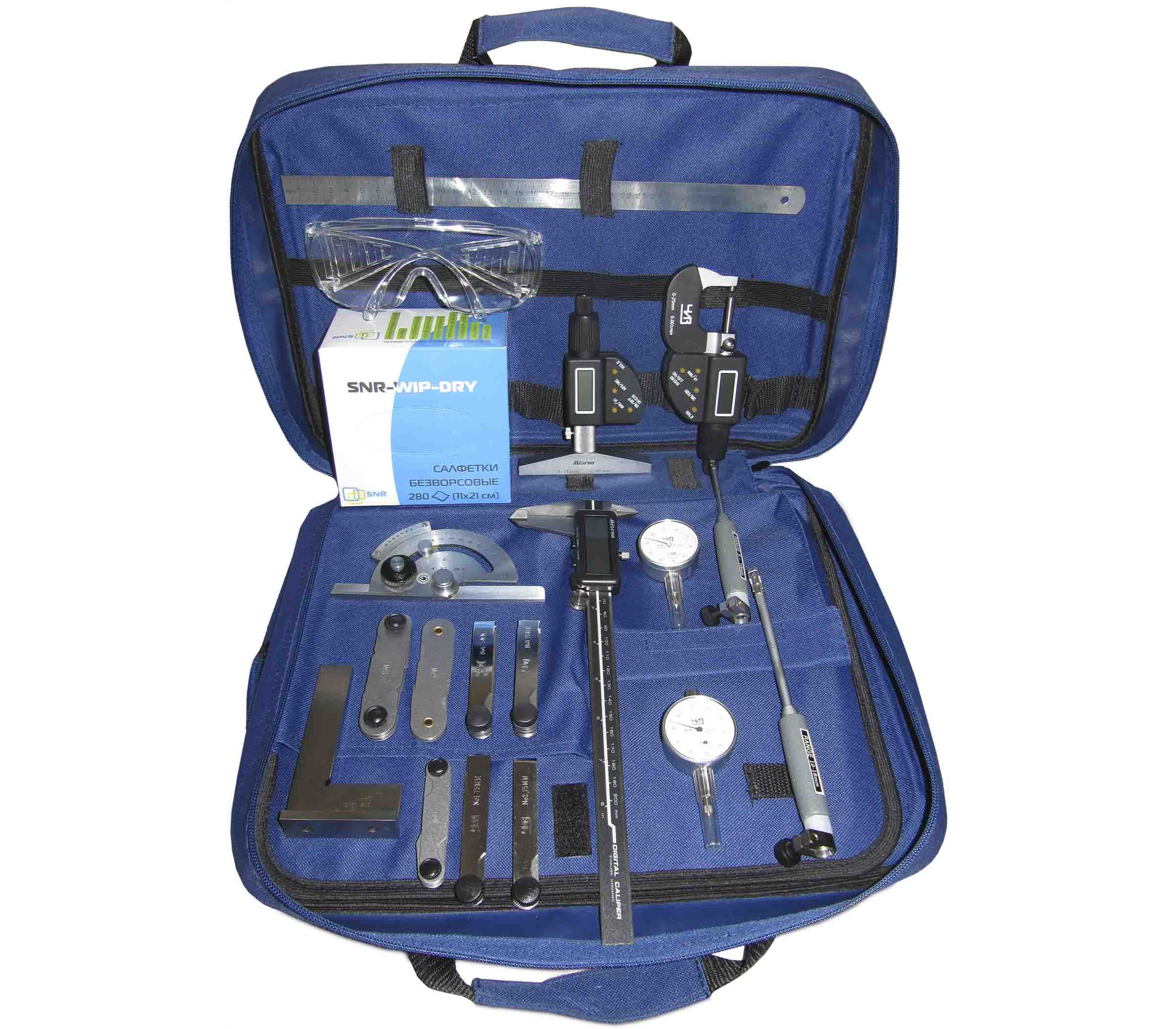 В набор входят электронный штангенциркуль с глубиномером, электронный микрометр, нутрометр, глубиномер, угломер с нониусом и лупой, угольник поверочный, линейка, набор щупов и радиусных шаблонов.