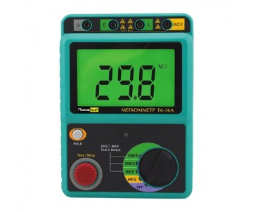 Мегаомметр ПрофКиП Е6-36А измеряет сопротивление изоляции в диапазоне от 1 кОм до 20 ГОм. Измеритель сопротивления изоляции позволяет производить измерение напряжением от 500 В до 2500 В, которое разбито на 3 фиксированных режима. Помимо сопротивления, прибор позволяет измерять напряжение электрической цепи до 600В. Тестер изоляции ПрофКиП Е6-36А при измерении выводит показания на ЖК-дисплей, оснащенный подсветкой.