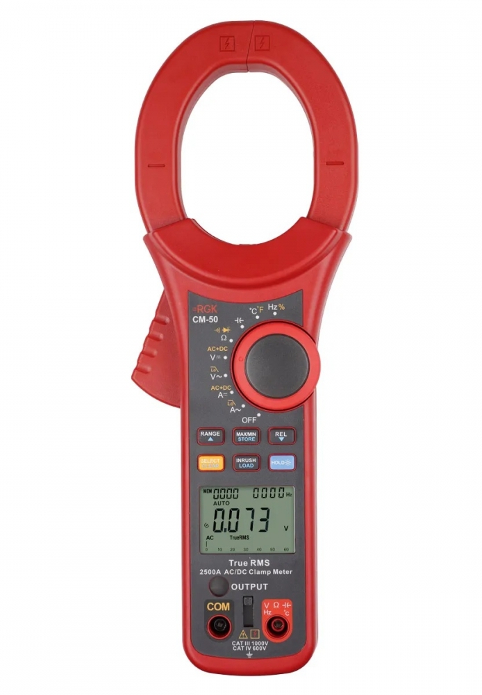 Клещи токоизмерительные RGK CM-50 - профессиональный прибор для замеров силы тока до 2500A бесконтактным методом. Инструмент автоматически выбирает рабочий диапазон и определяет тип тока - постоянный или переменный, что позволяет работать более эффективно, без лишних затрат времени на настройку.