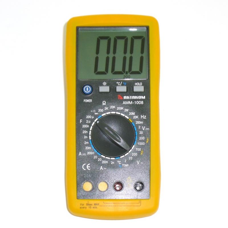 Мультиметр АММ-1008 представляет собой надёжный и недорогой прибор, имеющий широкий набор типичных измерительных функций и большой ЖКИ (2000 отсчётов) с крупными цифрами и подсветкой. Его можно так же применять для диагностики автомобильных цепей и мощных бытовых приборов, благодаря расширенному диапазону тока (кратковременно до 20 А).