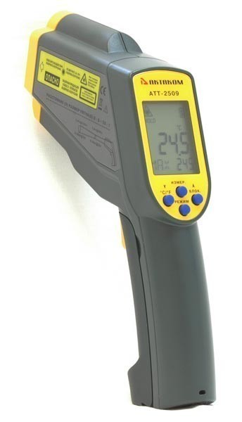 Инфракрасный термометр АТЕ-2509 предназначен для точного измерения температуры поверхностей пирометрическим способом. Для большей точности измерения прибор снабжен двухточечным лазером и может сохранять в памяти максимальное и минимальное значения, а также подавать сигнал о превышении заданного порога.